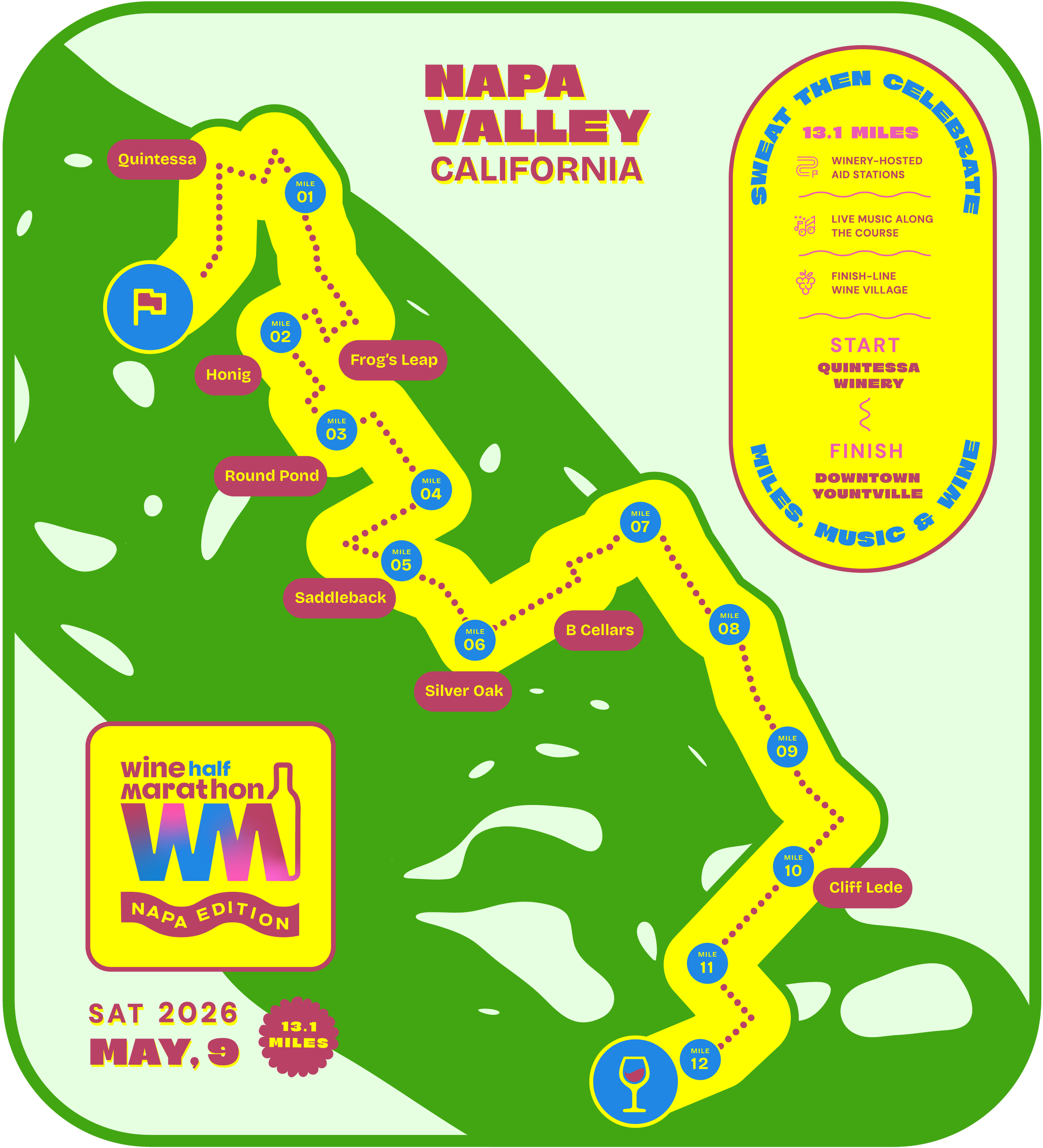 The race follows a half marathon (13.1 miles) format on a thoughtfully designed point-to-point course through Napa Valley.